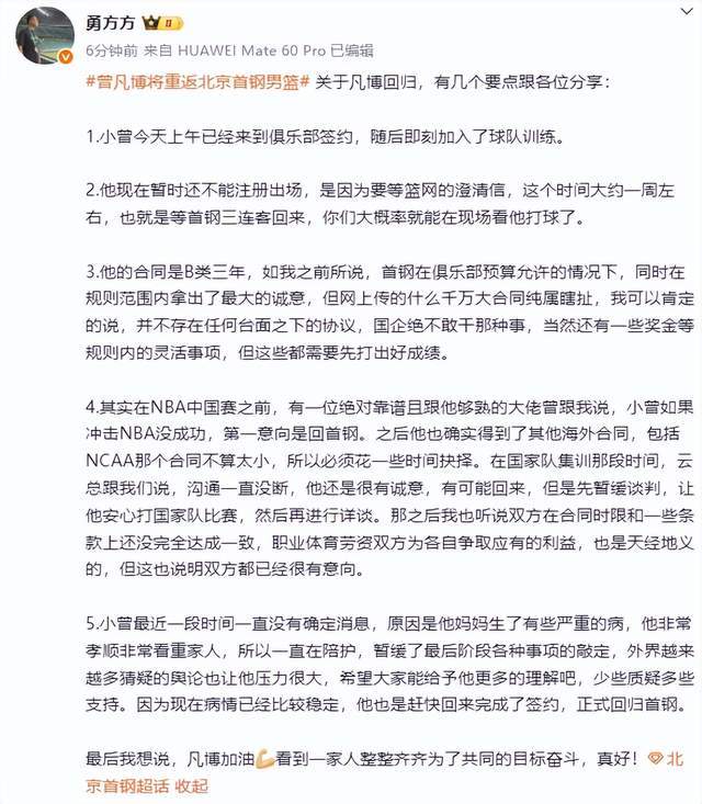 • 北京首钢官宣曾凡博回归!3年B类合同,多方辟谣千万年薪